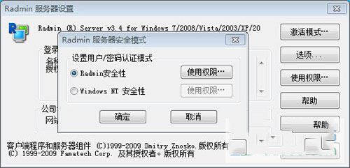 6、在“Radmin服务器设置”窗口点“使用权限”按钮,弹出“服务器安全模式”窗口。如下图所示: