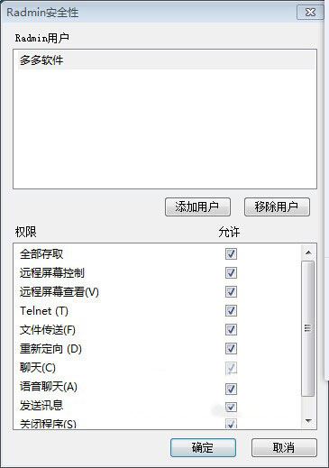 7、在以上窗口选择Radmin安全性,右边点“使用权限”按钮,用来添加登陆服务器的用户名和密码,我这里用的是用户名:多多软件,密码:123456。如下图所示: