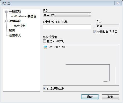 闪电按钮来连接到服务器,选择联机模式,在ip地址或dns名称栏输入ip地址,我这里服务端的ip地址是192.168.1.100,联机选择完全控制,如下图所示: