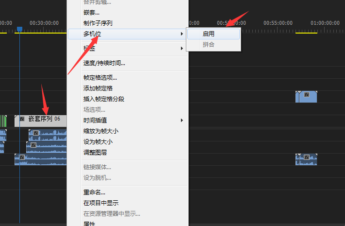 5、同步后,右击选择嵌套,嵌套之后就变成一条轨道上面的素材,
