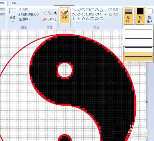 6、利用放大镜放大3倍,并选择铅笔工具,利用铅笔工具点击方块,最终达到红色区域变为黑色。