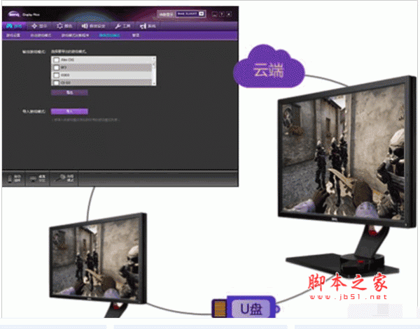 1、玩家还可将自己惯用的游戏模式设定上传至云端或下载到U盘上,通过传输到另一台装备后,调出后即可使用。这大大的方便了专业游戏玩家在训练上训练到赛场上显示器参数的无缝切换。