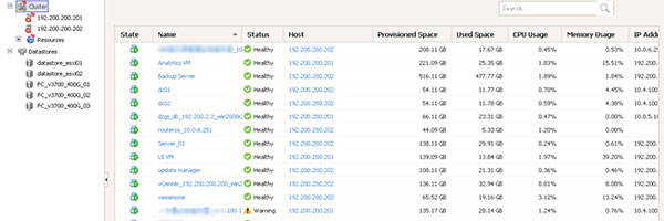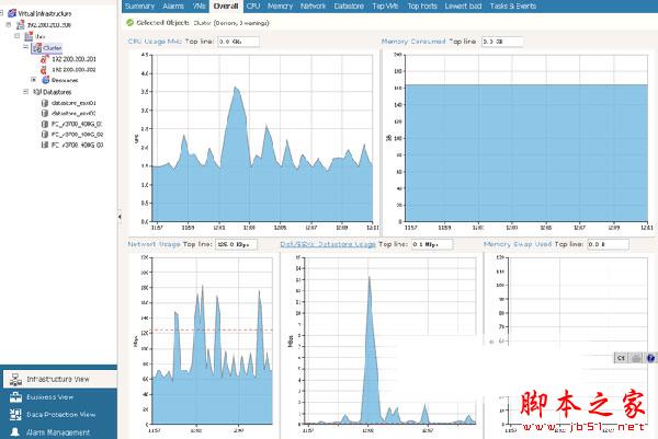 13、完成添加后,就能对整个虚拟化平台进行监控及查看。了解每个虚拟机的运行情况,ESXi主机的运行情况等,集群中虚拟机运行情况,如下图,包括CPU资源、内存资源及使用情况、CPU资源使用情况等。