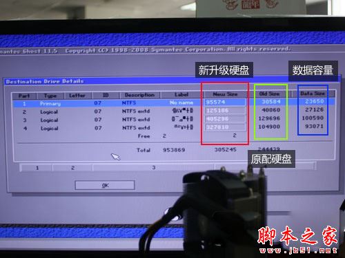 随后我们可看到目标数据硬盘的分区容量校准界面,主要是为新升级硬盘的分区存储空间大小。Ghost工具会自动分成和原配硬盘一样多的分区,同时还会自动分配存储空间。当然用户也可以调整存储空间,实际黄色和蓝色方框内存的数字不可调节,只有红色方框内的白色字体,可以调整大小。