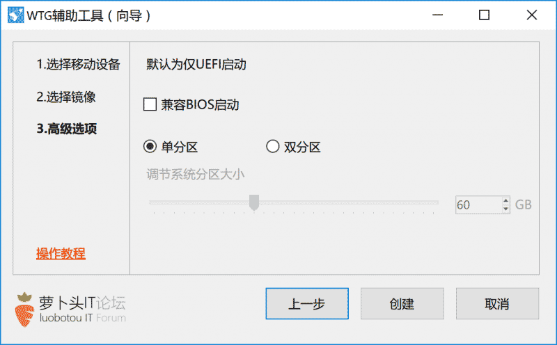默认设置下,程序将使用UEFI+GPT模式制作,勾选“兼容BIOS启动”后,使用UEFI+MBR模式制作,不支持纯BIOS模式制作。