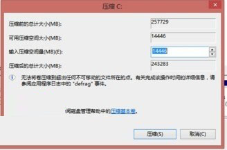 在打开的压缩卷窗口中,在“输入压缩空间量”处输入合适的数值(一般1G就够了),如下图所示: