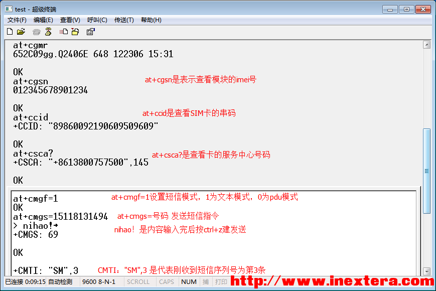 发短信,输入AT+CMGS=15118131494按回车(15118131494 为手机号) 按提示在〉后输入内容后按Ctrl+Z发信息