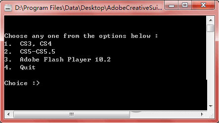 这里要选择你需要的卸载模式,如果卸载Adobe CS3/CS4的软件,则输入数字1,然后回车;要卸载Adobe CS5/CS5.5,则输入数字2并回车,要卸载Adobe Flash Player,则输入数字3并回车。