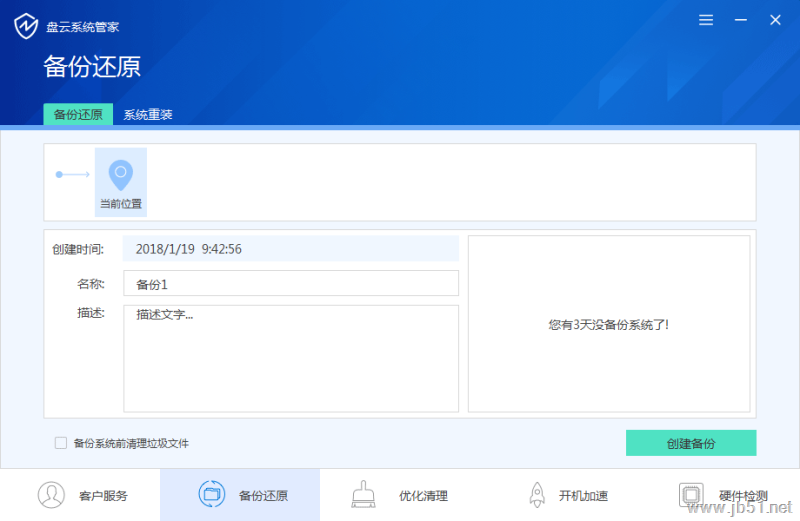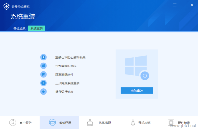 系统优化软件(盘云系统管家)是一款功能非常强大的电脑管家软件,系统优化软件(盘云系统管家)拥有备份还原、优化清理、开机加速、硬件检测等功能。系统优化软件(盘云系统管家)还能轻松找到为您安装系统的系统服务商,让专家来解决你的系统卡顿、运行速度慢等问题。不太清楚该软件是如何使用的朋友,可以阅读这篇文章,了解一下它是如何备份、安装和优化系统的。