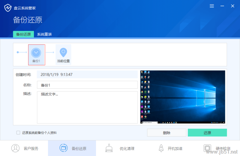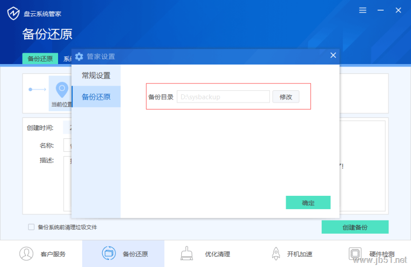 备份还原:点击创建备份并选择需要备份的盘,开始备份即可。