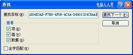 4、然后在搜索框中输入关键词:{AD04E3AB-F7B8-4F06-AC4A-D4901324CBAA}→查找下一个