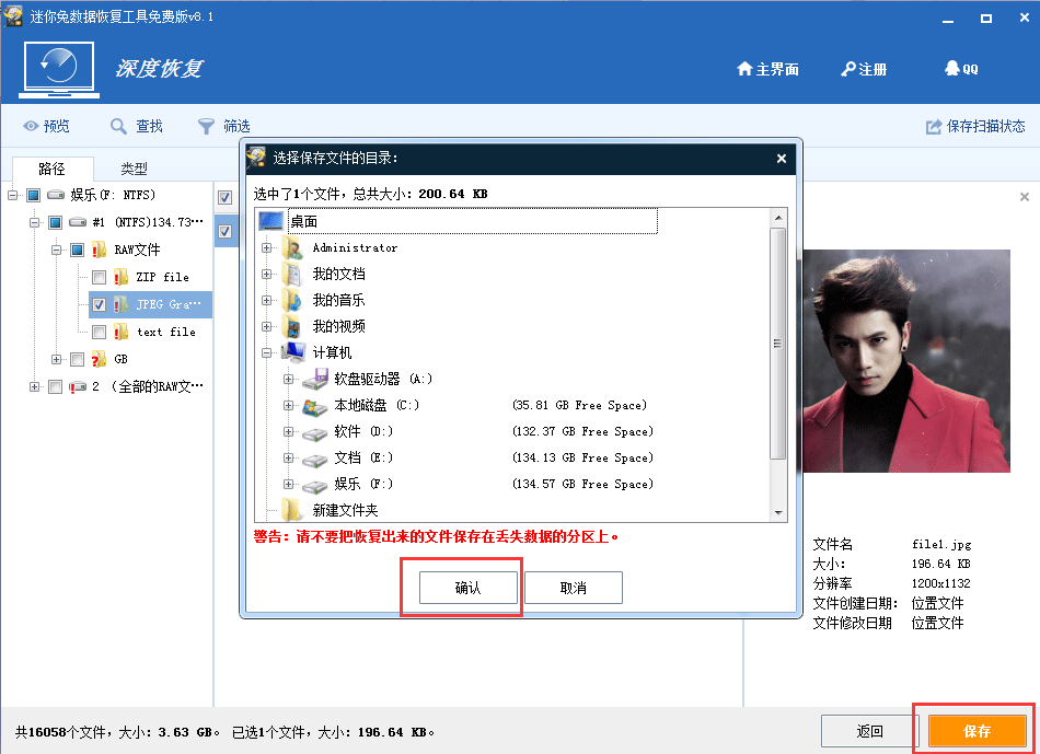 第三步:等待扫描结束,在丢失数据的列表中手动勾选需要恢复的数据然后保存到安全磁盘中,回收站被清空的数据就恢复出来了