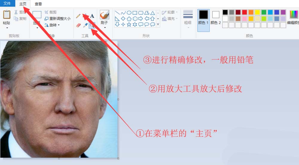 2、在画图工具的菜单里,找到“主页”,一般打开画图,就是这个界面。认识一下放大镜和铅笔工具,精确修改离不开这两个工具。