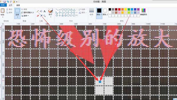 6、如果你对刚才的精度(放大的级别)还不满意,那么请在刚才最后一步的基础上,按一下键盘上的“PrtSc",printscreen这个键是复制整个屏幕的意思。当你再次在画图里粘贴(ctrl+v)的时候,你会发现刚才的4个白色小方格貌似又放大了50倍!如图