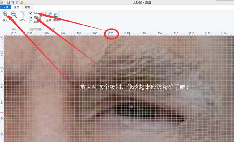4、图片放大了,可以用铅笔选色修改了。为了精确,我们在图片上添加网格线和标尺,它们在菜单栏的“查看”里。快捷键是ctrl+G和ctrl+R,添加了网格线和标尺后,修改是不是更有把握了?