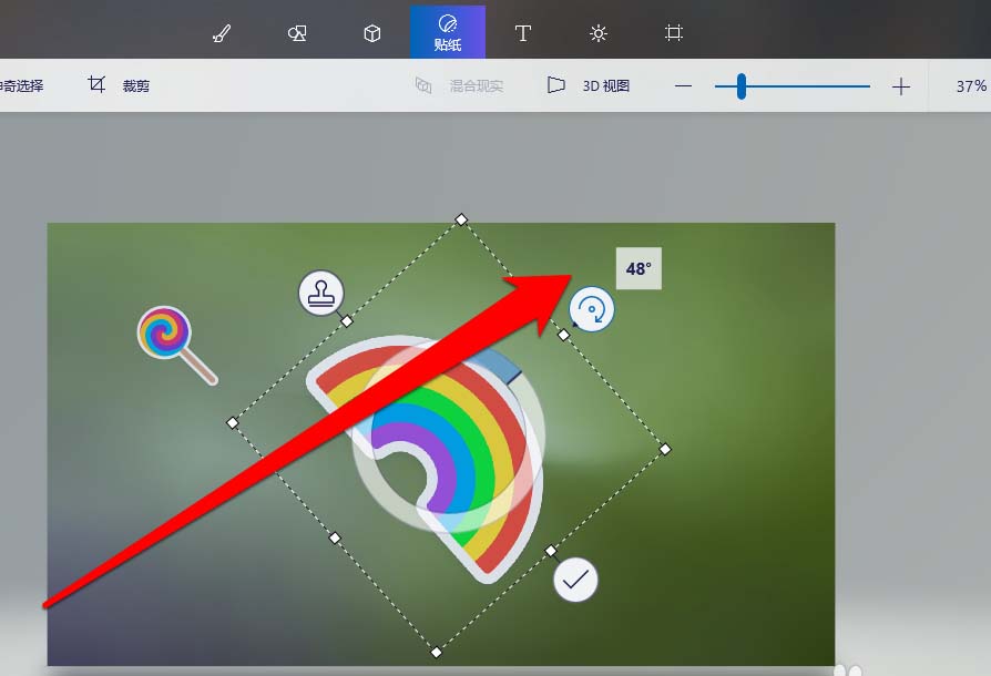 7、我们首先将贴贴纸,进行按角度旋转。