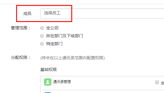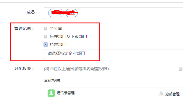 5、管理范围中设置子管理员的权限范围,可以选择全公司、所在部门或指定部门