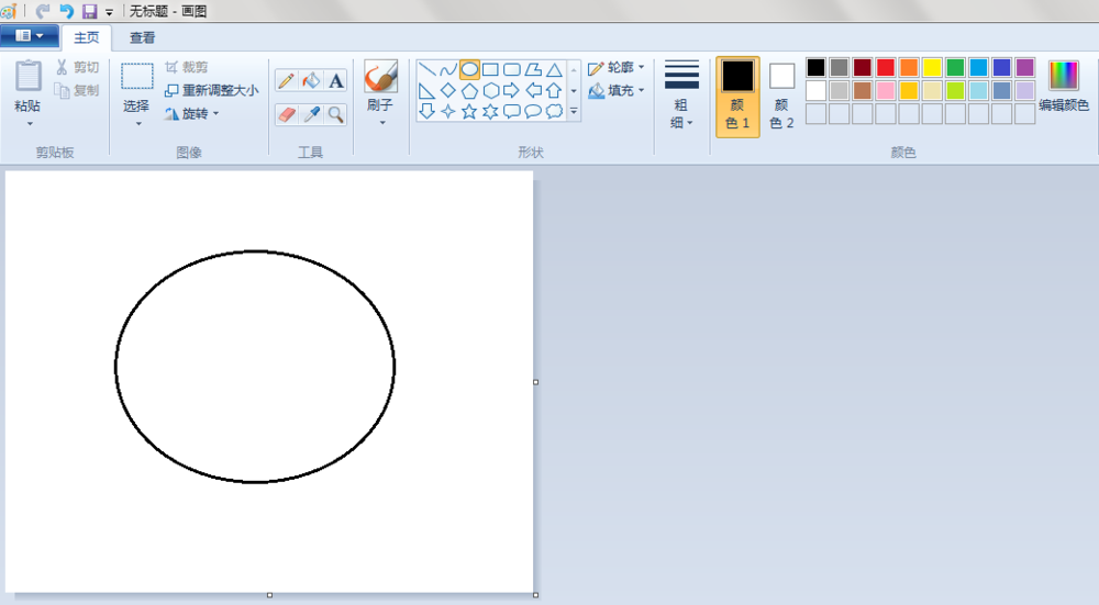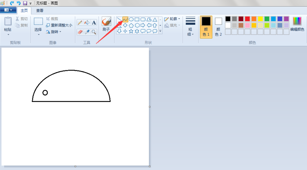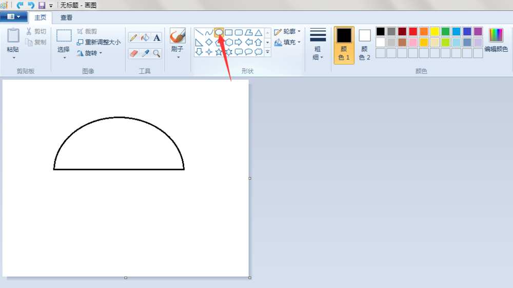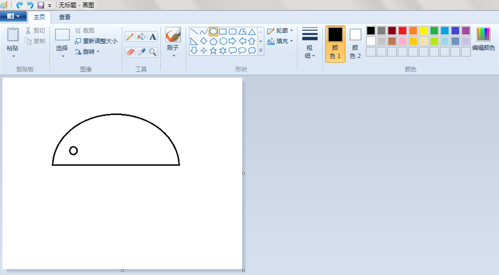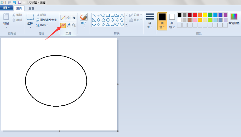 2、鼠身:点击“椭圆形”按钮,线条粗细(第二个)先在“画纸”适当位置上画一个椭圆;点击“橡皮擦”按钮,将椭圆擦掉一半;点击“直线”按钮,在擦掉的地方画上一条直线。