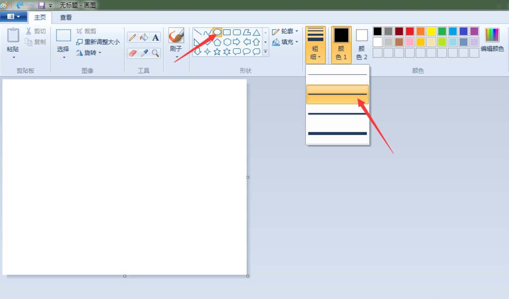 2、蘑菇菌盖:点击“椭圆形”按钮,线条粗细(第二个)先在“画纸”适当位置上画个椭圆;点击“橡皮擦”按钮,将椭圆擦掉一些变成半圆;点击“直线”按钮,如图的地方画一条线。