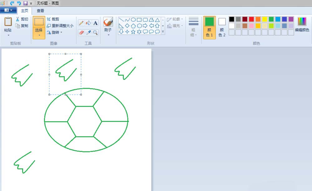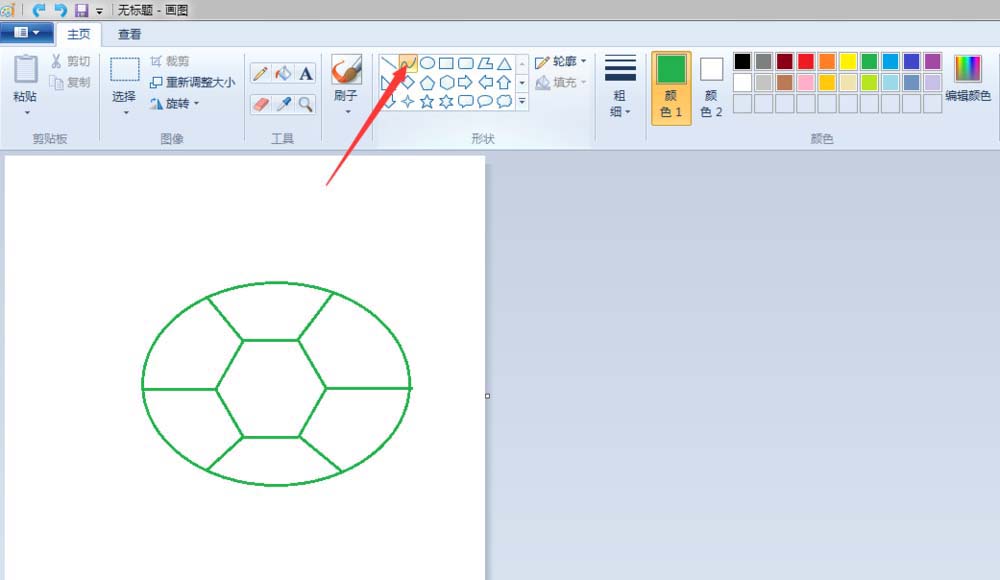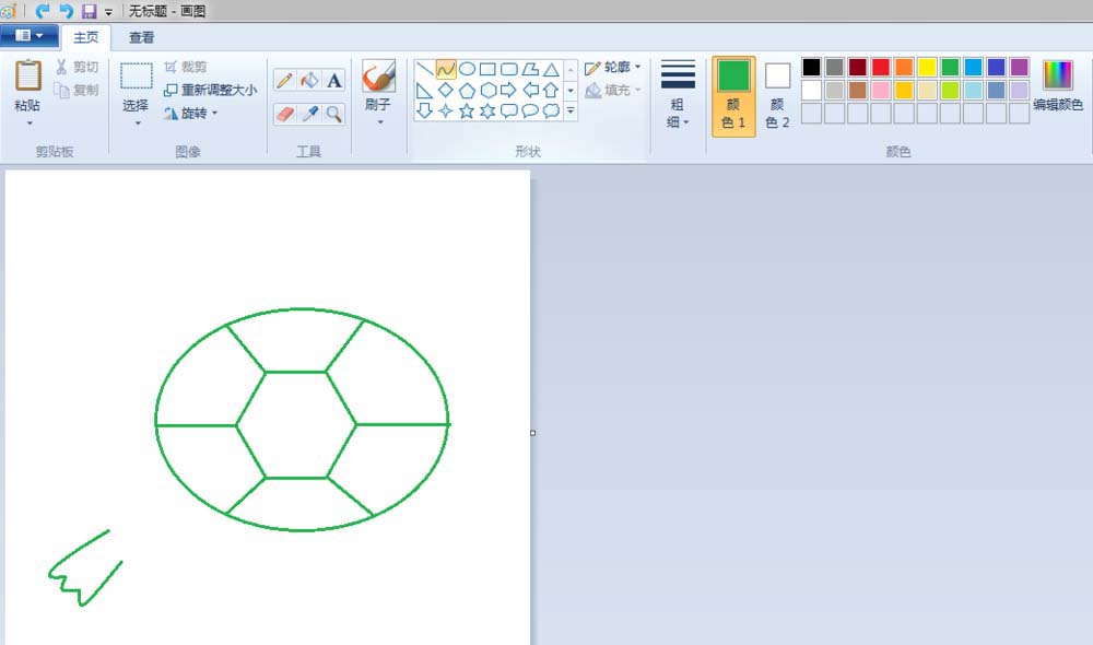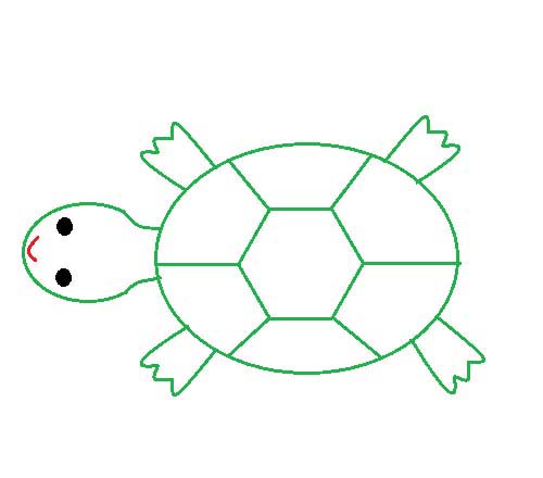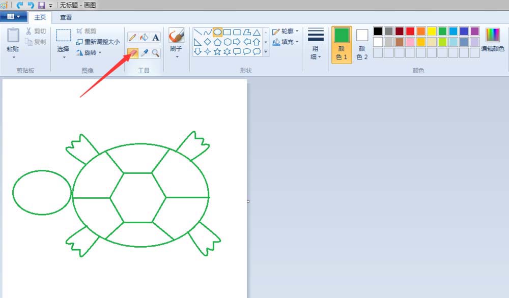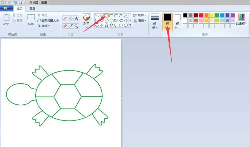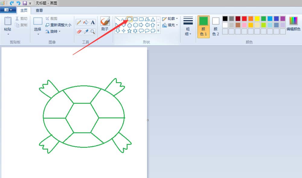 2、龟壳:点击“椭圆形”按钮,线条粗细(第二个)之后都不变,颜色改成绿色(颜色1前景色变,颜色2背景色不变)先在“画纸”适当位置上画个椭圆;点击“六变形”按钮,在椭圆的中间画一个六边形;点击“旋转”按钮,将画好的六边形,旋转一下位置,调整到适合的大小;点击“直线”按钮,画出龟壳的纹路。