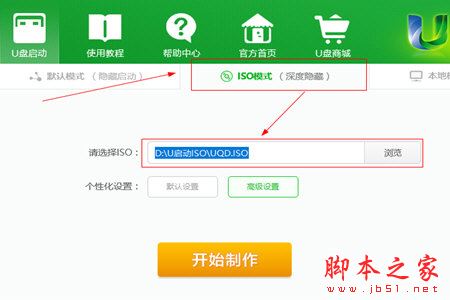 1、打开U启动软件,在主页面中,选择“ISO模式(深度隐藏)”,之后把准备好的U盘插进电脑的usb接口,等待几秒之后,软件就会自动识别U盘,再选择好ISO的保存路径点击开始制作即可。
