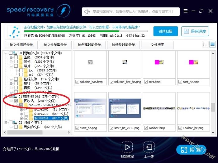 5、仅用几秒钟,软件已经找到很多删除的文件。 左边树形控件,“01 TEST-8G(H:)(253个文件)”,表示在H盘回收站里找到了253个清空回收站删除的文件。 这里要注意,有的文件删除后,文件名可能变化,如果找不到您删除的文件,请恢复所有文件,再整理。 用鼠标左键点击树形控件或列表控件上的小方框,勾选需要恢复的文件,左下角显示当前勾选的文件数量。然后点右下“恢复”按钮。
