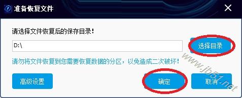 6、点击“选择目录”按钮,选择恢复的文件保存在哪个目录。然后点“确定”按钮。 注意:请不要将文件恢复到有数据需要恢复的分区里,以免造成二次破坏。