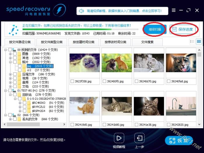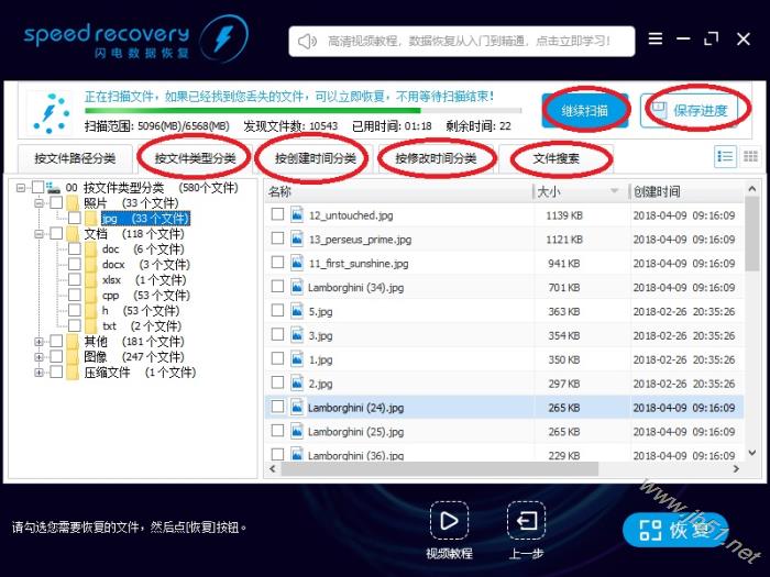 12、如果以上都没找到您删除的文件,请耐心等待扫描。随着扫描时间的增长,找到的文件越来越多。 我们软件拥有领先的边扫描边显示功能,如果不是数据损坏严重,都不需要等扫描结束,找到删除的文件就可以立即恢复。 您随时可以点击右上角的“暂停扫描”按钮,暂停扫描; 点击“保存进度”按钮,保存当前扫描到的数据,方便下次继续扫描。