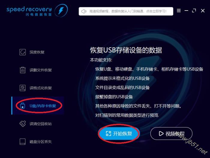 2、鼠标左键点击“U盘/内存卡恢复”按钮,然后再点“开始恢复”按钮。