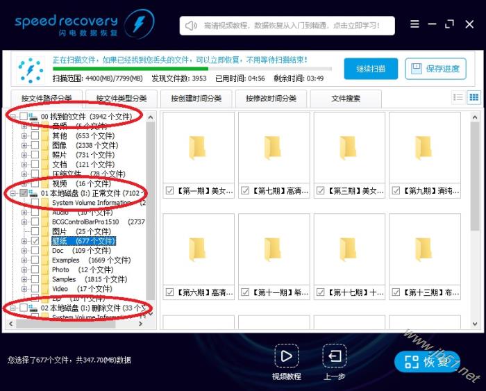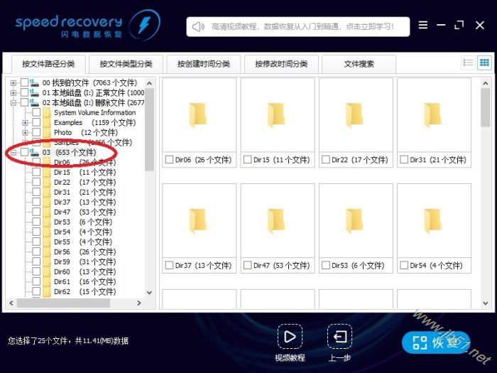 5、仅用几秒钟,软件已经找到很多删除的文件。 “01 Data(I:)正常文件(653个文件)”,表示在I分区找到了653个文件。 “02 Data(I:)删除文件(70个文件)”,表示在I分区找到了70个删除的文件。 用鼠标左键点击树形控件或列表控件上的小方框,勾选需要恢复的文件,左下角显示当前勾选的文件数量。然后点右下“恢复”按钮。