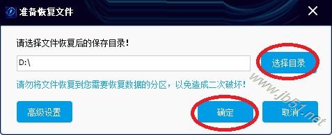 6、点击“选择目录”按钮,选择恢复的文件保存在哪个目录。然后点“确定”按钮。 注意:请不要将文件恢复到有数据需要恢复的分区里,以免造成二次破坏。