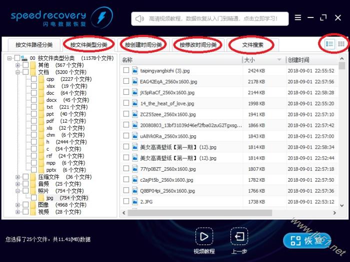 14、如果找不到您的文件,或找到的文件太多。 您可以使用“按文件类型分类”、“按创建时间分类”、“按修改时间分类”等功能查找您需要的文件。 您也可以使用“文件搜索”功能搜索您需要的文件。 您也可以切换浏览模式,然后按文件名、文件大小、文件时间排序排序。 点击立即学习,如何找到需要恢复的文件。