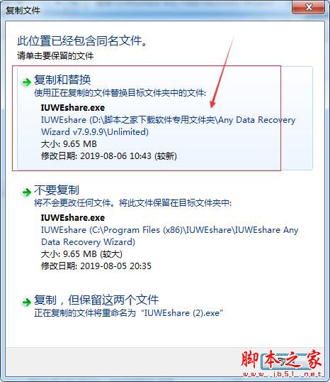 6、本站点提供Unlimited旗舰版和AdvancedPE版本两个版本的破解补丁,破解方法是一样的,本次小编以Unlimited旗舰版为例,将IUWEshare.exe复制到安装目录中(默认位置C:\Program Files (x86)\IUWEshare\IUWEshare Any Data Recovery Wizard)
