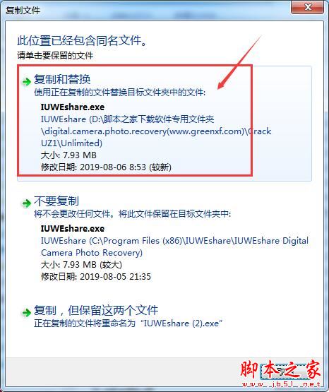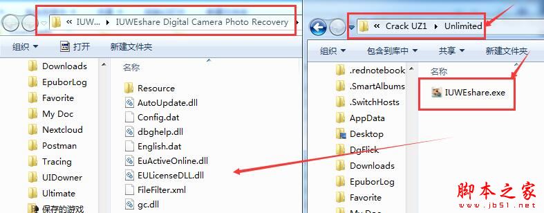 6、在Crack UZ1文件夹中找到破解补丁文件,大家可根据自己的实际需要进行版本选择,Unlimited旗舰版和AdvancedPE版本,破解方法是一样的,本次小编以Unlimited旗舰版为例,将IUWEshare.exe复制到安装目录中(默认位置C:\Program Files (x86)\IUWEshare\IUWEshare Digital Camera Photo Recovery)
