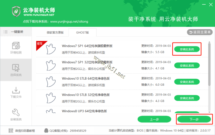 3、选择您想要安装的操作系统,云净提供Ghost版和微软官方原版供您选择,需要注意的是微软官方原版中的Windows 7不带网卡驱动,您需要提前下载好万能网卡驱动(百度:万能网卡驱动)放在您的D盘或者E盘。等系统安装完成后运行万能网卡驱动安装网卡驱动,避免无法上网。
