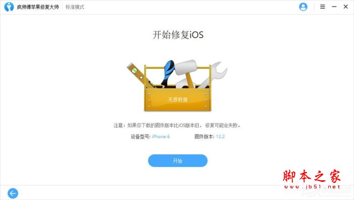 1、下载运行疯师傅苹果修复大师,然后选择“标准模式”进入下一步;