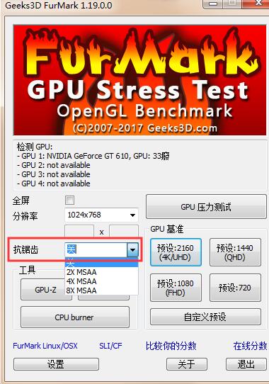 从ucbug软件站下载FurMark,根据提示安装软件,运行,如图,点击【Anti-aliasing】,设置为off,关闭抗锯齿功能,