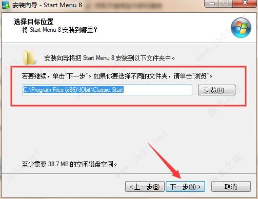 5.选择安装目录,但是脚本之家小编不建议安装在C盘,可以安装在其他磁盘,如D盘等(默认目录:C:\Program Files (x86)\IObit\Classic Start),如图