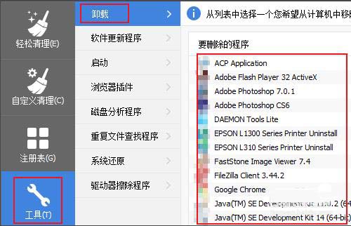 1、打开软件,点击“工具”,右侧第一个菜单“卸载”。里面是当前系统中安装的所有软件,选定某个软件,可以进行相关联的操作。