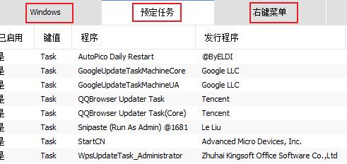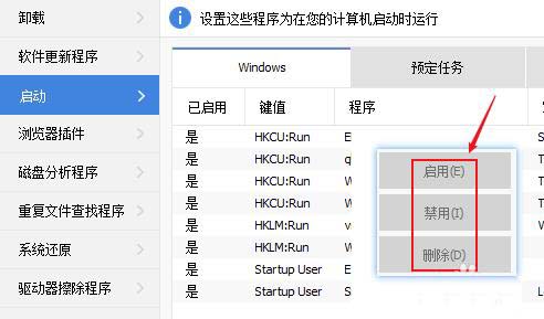 2、点击“启动”。启动中是系统一些启动项,预定任务,和右键菜单。选定一个项目,可以进行相关操作。