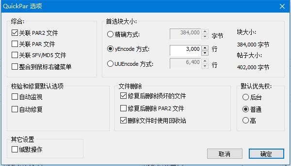 1、运行QuickPar,即进入如下的选项界面,可以对综合、首选块大小、检验和修复默认选项、文件删除等参数进行设置。