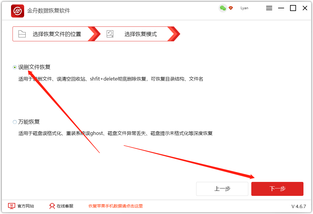 第二步、在这里,勾选“误删文件恢复”,然后点击“下一步”。