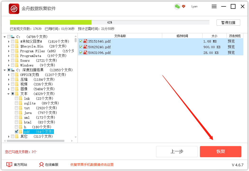 第四步、选择完需要恢复的文件后,点击“恢复”即可,无需等待扫描结束后。