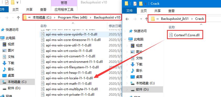 9、将软件包内Crack文件夹的补丁CortexIT.Core.dll粘贴到软件安装目录里(默认C:\Program Files (x86)\BackupAssist v10)