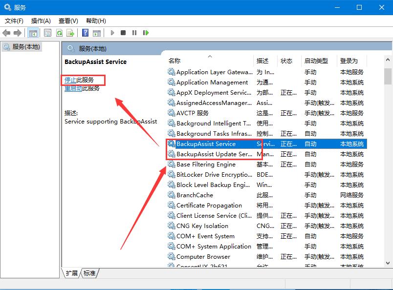 8、右键停止BackupAssist Service、BackupAssist Update Service服务