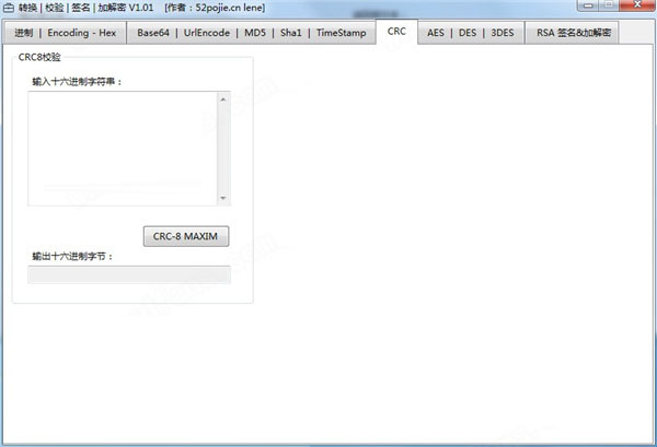 13、CRC8校验,输入十六进制字符串,选择CRC-8 MAXIM转换,输出十六进制字节在底部显示。