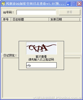 “风很凉QQ加密空间日志查看器”是一款绿色软件,随意解压到任意目录后就可以使用。运行之后,先要根据提示输入验证码,然后即可在文本框中输入要进行查询的QQ号码,点击查看按钮就会开始读取QQ空间里面的日志。