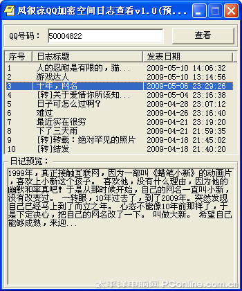 读取速度非常快,就会发现已经加密的QQ空间日至已经显示出来,点击日志标题就可以查看日志内容。要注意的是,这款“风很凉QQ加密空间日志查看器”只能查看纯文本内容的QQ日志,如果日志中有视频和图片,则无法进行查看。