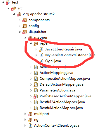 下载第2步中的压缩包,解压之后得到三个文件,把这三个文件夹添加到新项目的 org\apache\struts2\dispatcher\mapper包中,如下图