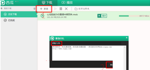 输入一个网络视频的地址,然后,就可以在西瓜影视上播放了,如首图。 新建下载,点击新建下载,在弹出的窗口输入URL,输入一个网络视频的地址,点击下载就可以了如下图。